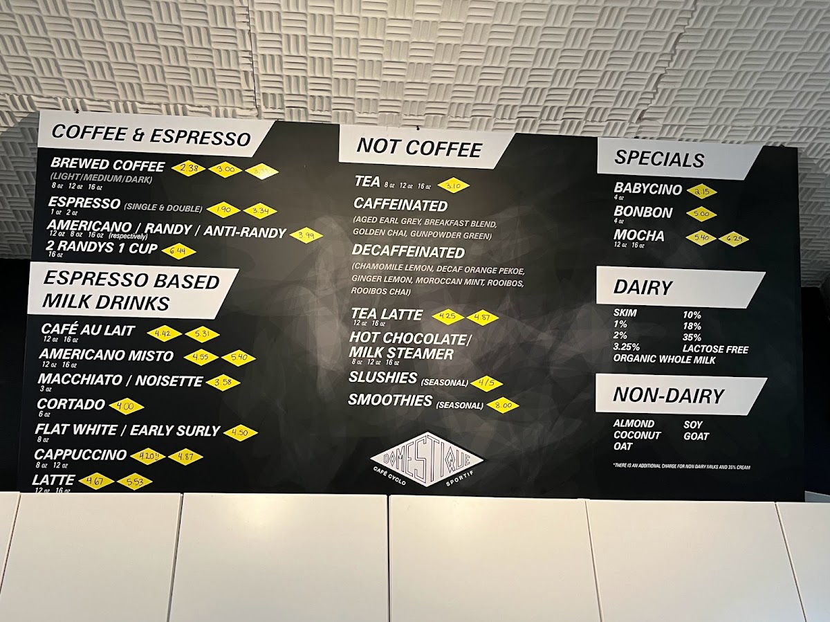 Café Domestiique's menu offers a delightful variety of dishes and drinks, catering to diverse tastes. For mains, the Grilled Cheese is a comforting classic, while the Meatballs in Pomodoro delivers rich, flavorful Italian goodness. The Hummus Plate and Smoked Salmon Plate provide fresh, light options for those craving something lighter. The coffee selection is top-notch, featuring Brewed Coffee and Espresso, along with the unique 2 Randys 1 Cup for those looking to try something different. Espresso-based milk drinks like the Café Au Lait, Americano Misto, and Macchiato stand out, with the Cappuccino and Flat White rounding out the choices for espresso lovers. For those not in the mood for coffee, there are options like Caffeinated and Decaffeinated drinks, Tea Latte, and indulgent choices like Hot Chocolate/Milk Steamer and Slushies. The Babycino and Mocha make for a special treat, while the Gin Fizz and Paper Plane provide refreshing alcoholic beverages. This thoughtful menu ensures there's something for everyone, whether you're stopping by for a quick coffee or enjoying a full meal.